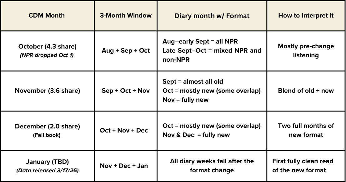 But that doesn’t mean the NPR loss isn’t the dominant factor. It’s completely reasonable — and frankly expected — that a portion of the 2.0 isn’t measuring who’s listening — it’s measuring who stopped listening when NPR went away.
